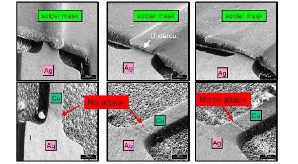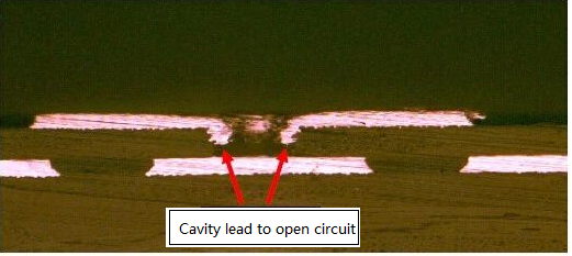 1,Open circuit at the joint of the pad and track covered by the solder mask.In the process of immersion silver, the copper at the undercut place of solder mask be corroded, see Fig. In the process of immersion silver, as the gap between the solder mask and CU is very small, limit the Ag ion supplying, but the Cu can corroded into CU ion, then the copper surface occur immersion reaction outside the gap. Because ion conversion is the motive force of the immersion silver reaction, the degree of attack on the copper surface under the crack is directly related to the thickness of the immersion silver. Uneven electroplated copper layer (thick copper at the hole), there is a noticeable deep scratch on the copper under the solder mask.