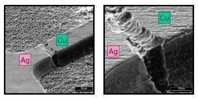 Figure1 Figure2 ![]() However, if there is a "crack" between the solder mask and the copper, the supply of silver ions in the crack is limited, but the copper under the solder mask can be corroded into Cu ions, which will provide electrons for Ag+ on the copper pad outside the crack(as shown in Figure 2 above). Since the amount of electrons required is proportional to the amount of reduced Ag ions, the intensity of the Galvanic effect increases with the exposed copper pad surface area and the thickness of the silver layer.