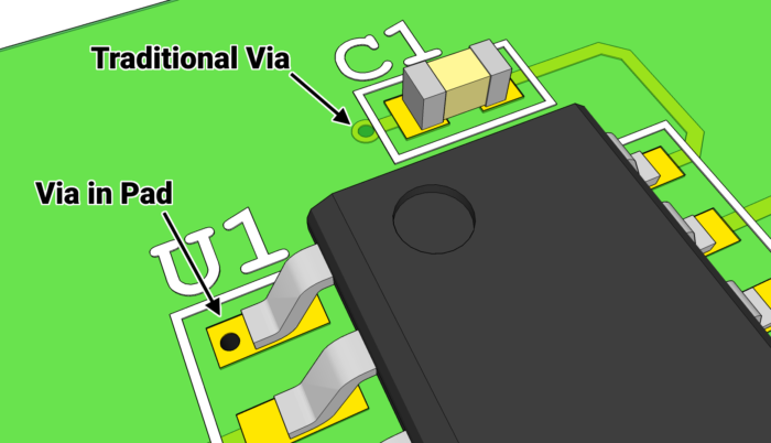 When should I use Via in Pad?Trying to route and escape component packages with sub 0.5mm pitch with traditional routing methods will cause Design Rule Check errors due to trace width, annular ring, and drill size limitations. Manufacturing limitations on trace size does not allow for smaller and more compact traces to be made with traditional PCB fabrication methods. For these small pitch components, the only effective way to route them is with capped via in pad as this allows the PCB routing to be as compact as possible.