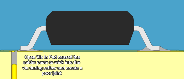 With traditional vias, the signal is routed away from the pad and then to the via. This allows the application of soldermask to prevent solder paste from wicking into the via during the reflow process. In doing so, this prevents a situation which can cause the pad and component connection to fail due to insufficient solder. With via in pad, the drill hole for the via is inside the pad. This means you can not tent the via with soldermask. Leaving the via open to allow the paste to wick into the barrel will cause reliability problems during manufacturing.