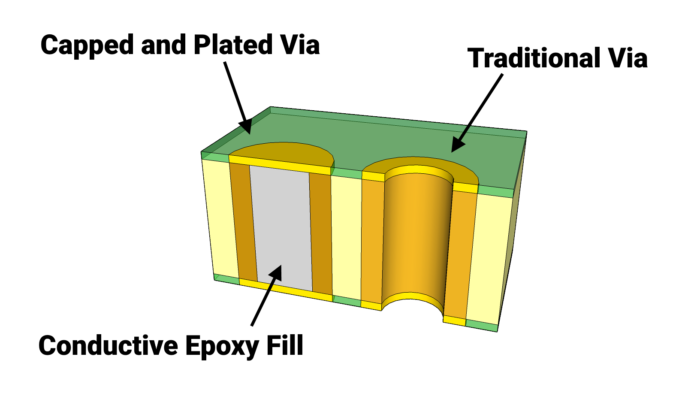 Capped via in pad can simplify routing for complex BGA and LGA packages as well. Instead of the traditional fan out, the signals can go straight into the PCB. Surface routing is minimized which can allow components like bypass capacitors to be placed as close as possible to other components, minimizing parasitic inductance. Also, this enables shorter paths to power and ground planes which will help minimize EMF emissions of high-frequency designs.