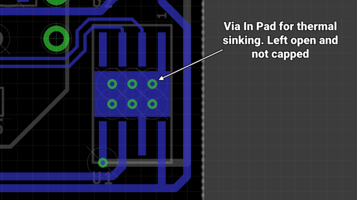 To properly manufacture PCBs that have via in pads, an additional manufacturing file is necessary. Besides the standard excellon drill file that is required, a drill file that just contains the vias that are in component pads and need to be capped and filled is also needed. Using two separate files reduces confusion on which vias need to be capped and reduces manufacturing cost by making sure traditional vias do not get filled and capped. Consult your EDA tool to see if there is an option to do this. If not, modifying your drill file with a gerber viewer might be needed to create this extra file. Exceptions to Always Capping Via in PadsWith most design rules there are exceptions and the “Always cap via in pads” is no exception to that rule! Center pads on QFN packages and thermal center pads for surface mount power parts generally benefit to having open via in pads. Without vias in the center pad of a QFN you can some times get trapped gasses or a lifting motion during reflow. These can cause the component to tilt to one side and lose coplanarity to the PCB. The vias in the center pad allow gasses made from the flux in the solder paste to more easily escape and also allows any excess solder paste that is under the part to be drawn through. With thermal pads this extra solder paste that fills the vias has the benefit of improving the thermal conductivity of the via.